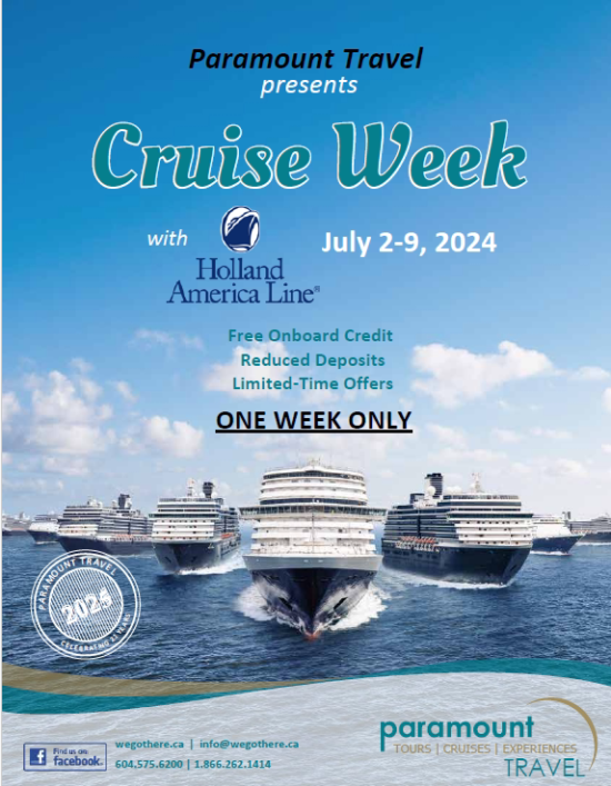 Let’s Set Sail! Cruise Week is coming July 2-9, 2024. Enjoy a week of savings with Holland America. Take advantage of Free Onboard Credit, Reduced Deposit and Limited-Time Offers. Check out our CRUISE WEEK brochure for a sampling of itineraries that don’t even scratch the surface on all the amazing options to choose from. Cruise Week…
